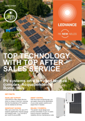 LEDVANCE plans and provides solar power systems for twelve residential buildings in Acquapendente, Italy, with a total of 170 high-efficiency solar panels. The photovoltaic solutions combine state-of-the-art technology with long-term operational reliability and low maintenance requirements, feature transparent and user-friendly app monitoring, and reduce energy costs by up to two-thirds – all in combination with an after-sales service that is one of a kind on the market.