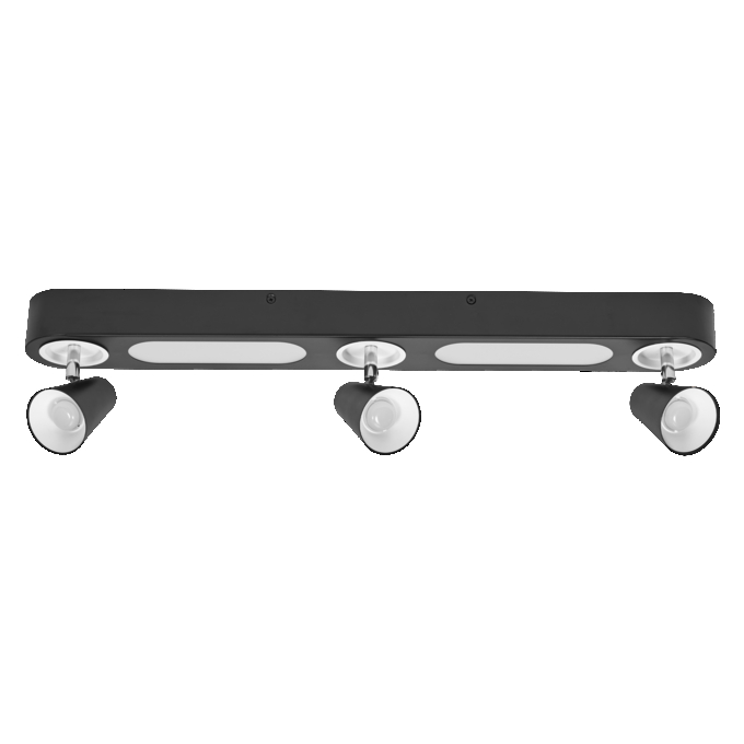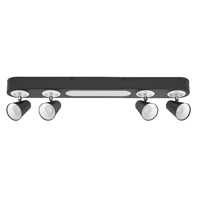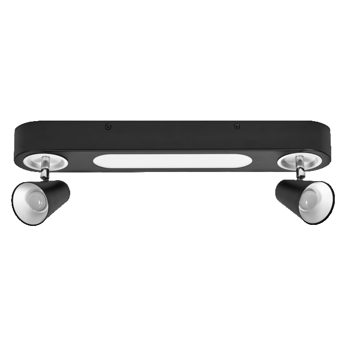 Ceiling mounted luminaires with adjustable spotlights featuring selectable light sources via wall switch