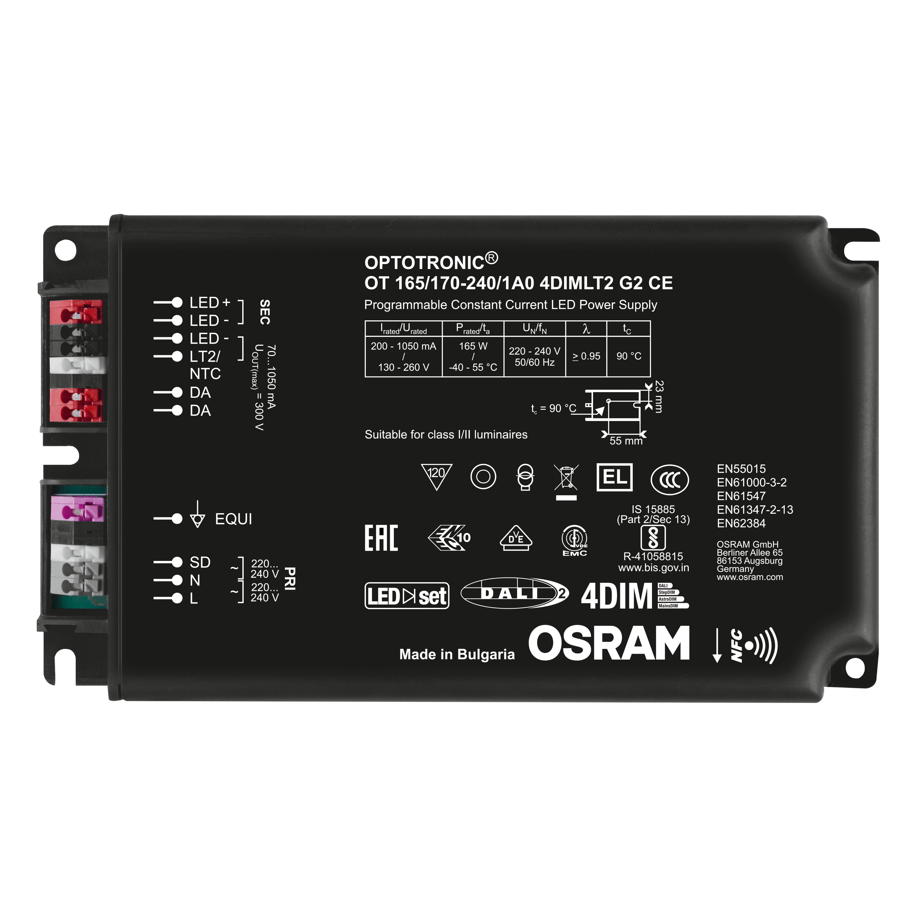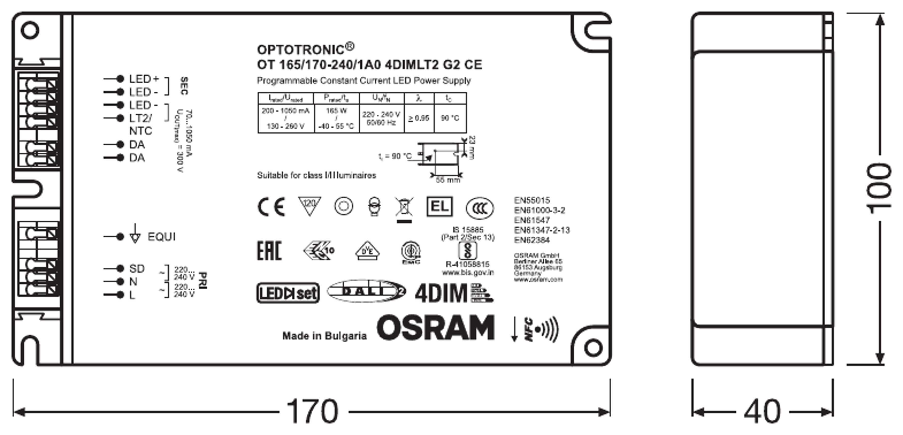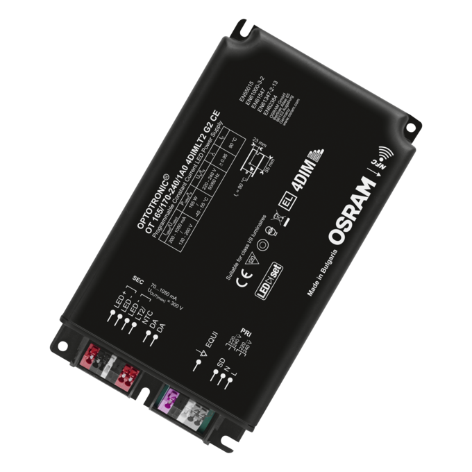 | Standardit | EN 61347-1:n mukaisesti, EN 61347-2-13:n mukaisesti, EN 62384:n mukaisesti, EN 55015:2006 + A1:2007 + A2:2009:n mukaisesti, EN 61547:n mukaisesti, FCC 47, osan 15, luokan B:n mukaisesti, IEC 61000-3-2:n mukaisesti, IEC 61000-3-3:n mukaisesti, IEC 62386-101:n mukaisesti, IEC 62386-102:n mukaisesti, IEC 62386-207:n mukaisesti, UL-8750 |